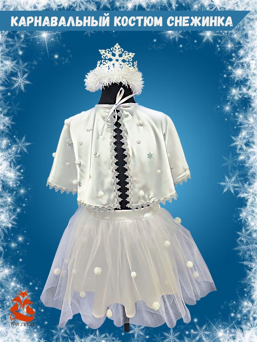 В комплект входит белая накидка и юбочка, украшенные снежинками и другими аксессуарами, а также ободок с символом праздника. Ткань - креп-сатин. Относить костюм Снежинка не стоит исключительно к новогодним мероприятиям. Это могут быть и другие торжества: театральные постановки, детские съёмки, дни рождения. Поэтому смело приобретайте данный образ для различных праздников.