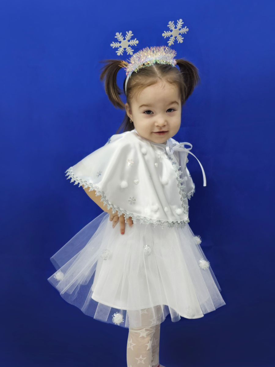 В комплект входит белая накидка и юбочка, украшенные снежинками и другими аксессуарами, а также ободок с символом праздника. Ткань - креп-сатин. Относить костюм Снежинка не стоит исключительно к новогодним мероприятиям. Это могут быть и другие торжества: театральные постановки, детские съёмки, дни рождения. Поэтому смело приобретайте данный образ для различных праздников.