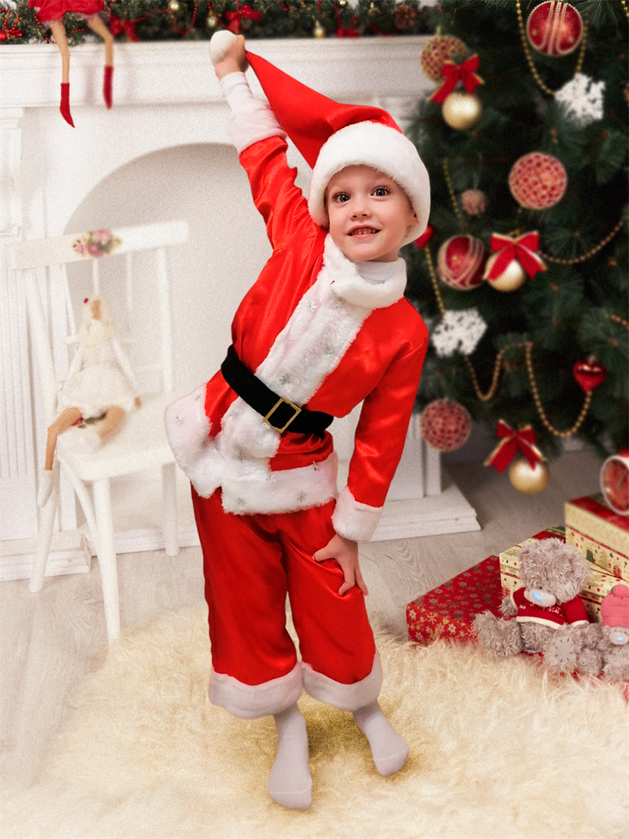 Детский новогодний костюм Санта Клауса для мальчика на утренник, спектакль и праздничный маскарад представляет образ персонажа западного фольклора. В комплект входит кофта свободного кроя с длинным рукавом, прямые штаны, шапка-колпак. Ткань костюма красного цвета сочетается со вставками из искусственного белого меха на вороте, манжетах рукавов, по центру и в нижней части кофты.